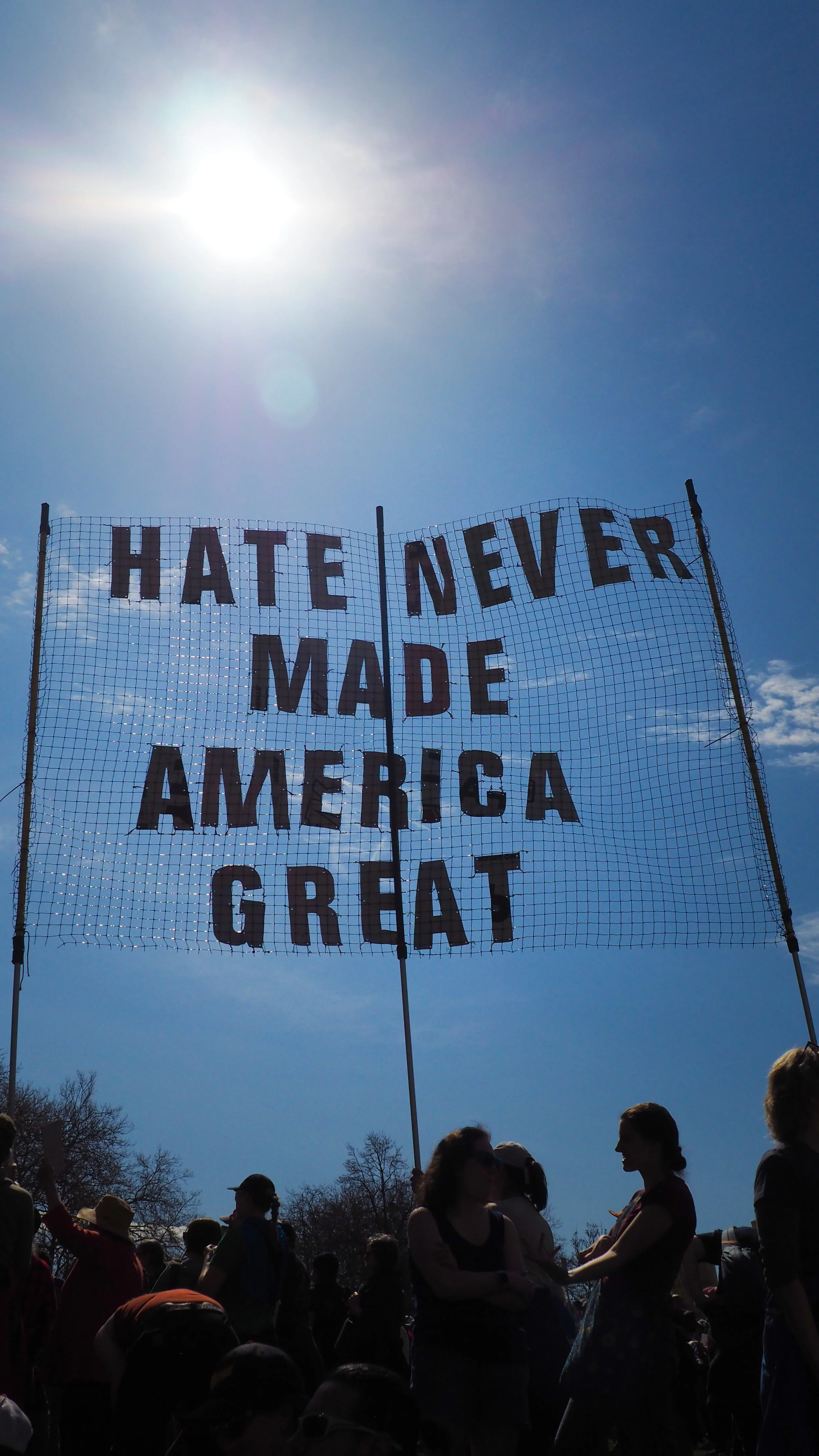A large sign from the April 5th, 2025 “Hands Off” protests in Seattle reads, “Hate Never Made America Great.”