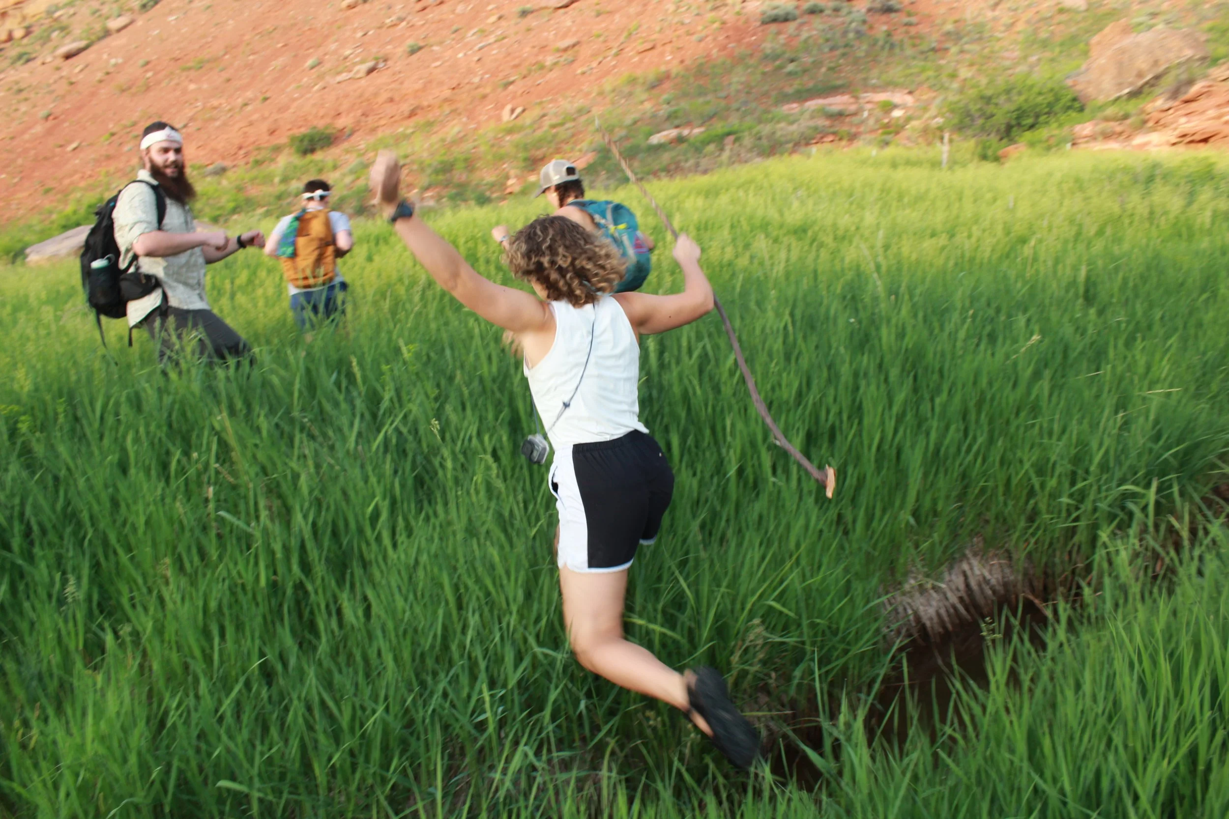 Cat, a National Outdoor Leadership School student, jumps a small divide while unwinding with friends during a rigorous Wilderness EMT course.