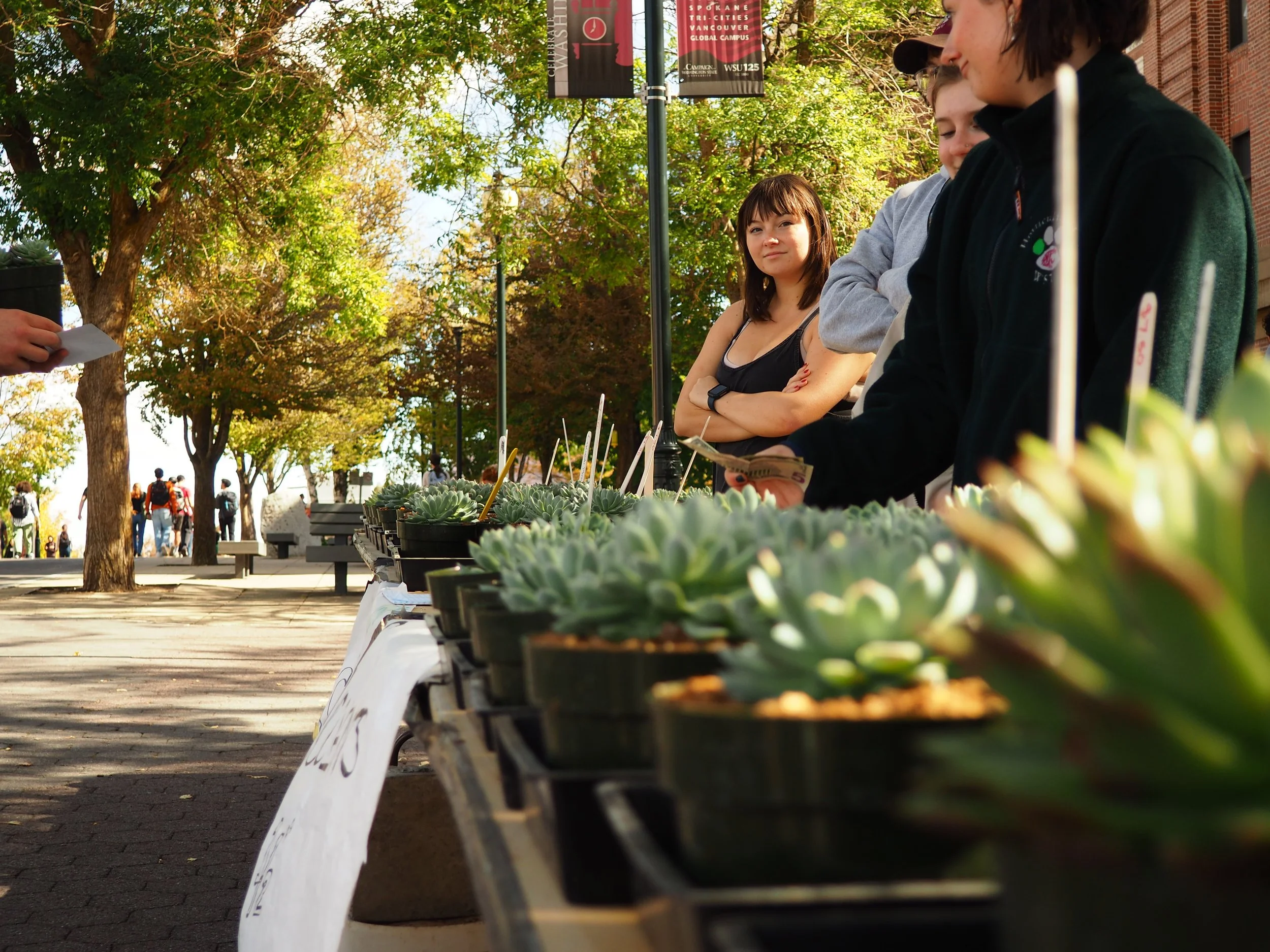 Annie Reyes, Agriculture and Food Systems major, smiles down the table of succulents at a succulent plant sale on the WSU campus.